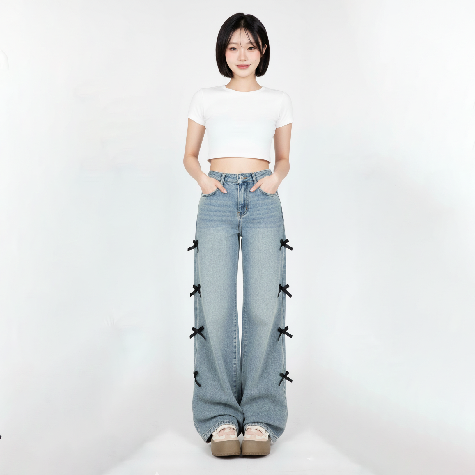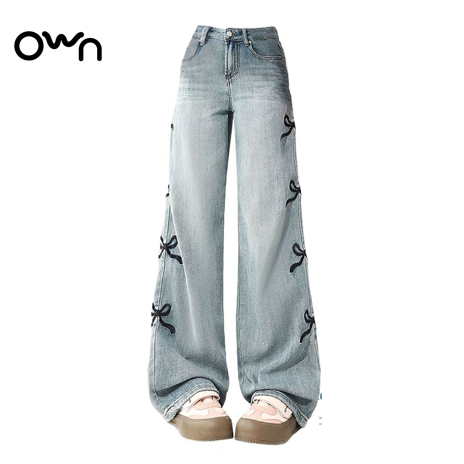 กางเกงยีนส์เดนิมขากว้าง ปักลายโบว์แถบข้าง