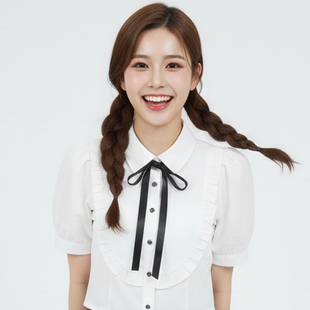 เสื้อเชิตสตรี กระดุมด้านหน้า ตกแต่งระบายรอบอกด้านหน้า มีปกผูกโบว์