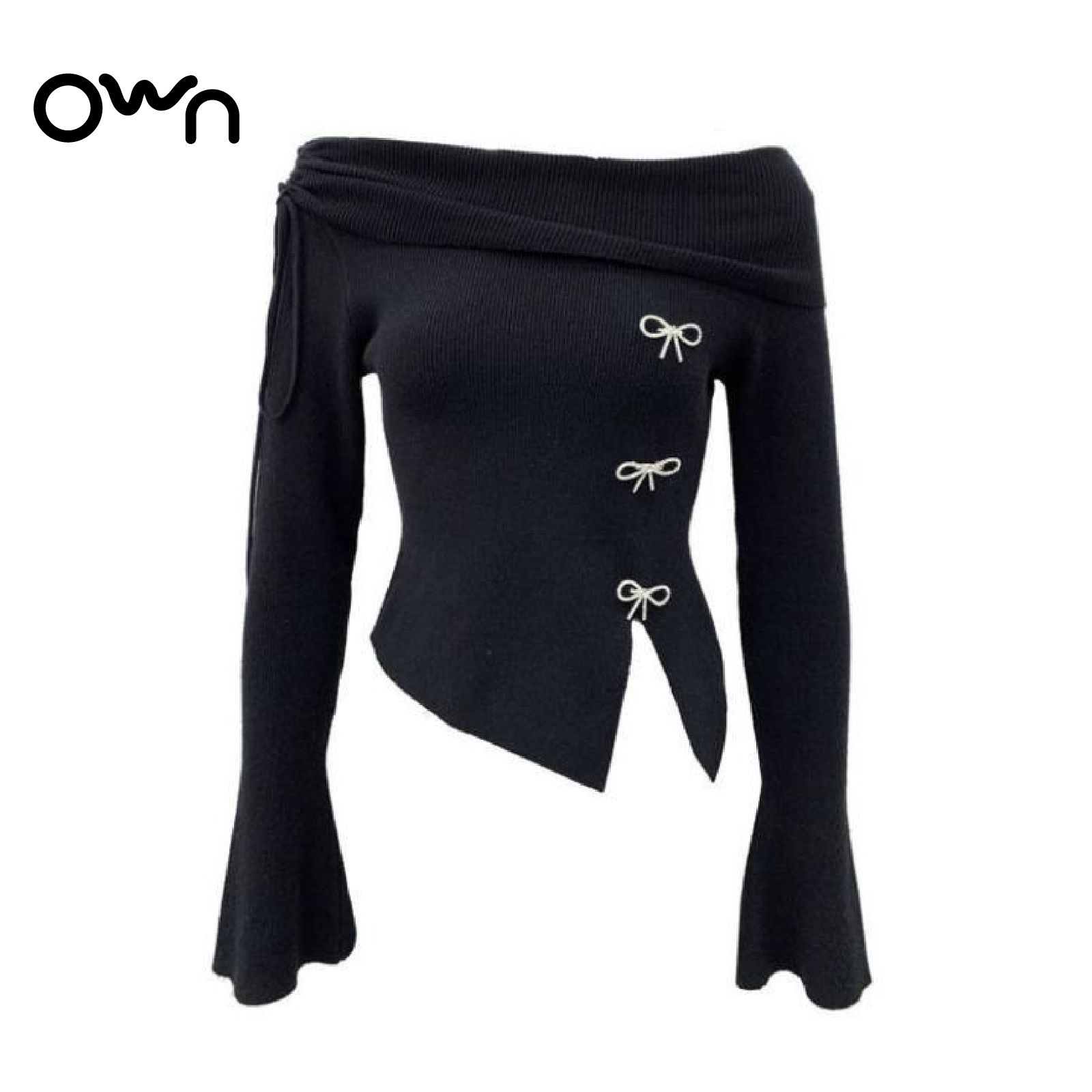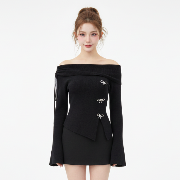 เสื้อไหมพรมแขนยาว ผ้านุ่ม ปาดไหล่ ติดอะไหล่ตกแต่งโบว์สีเงิน แหวกชายเสื้อ แขนบาน